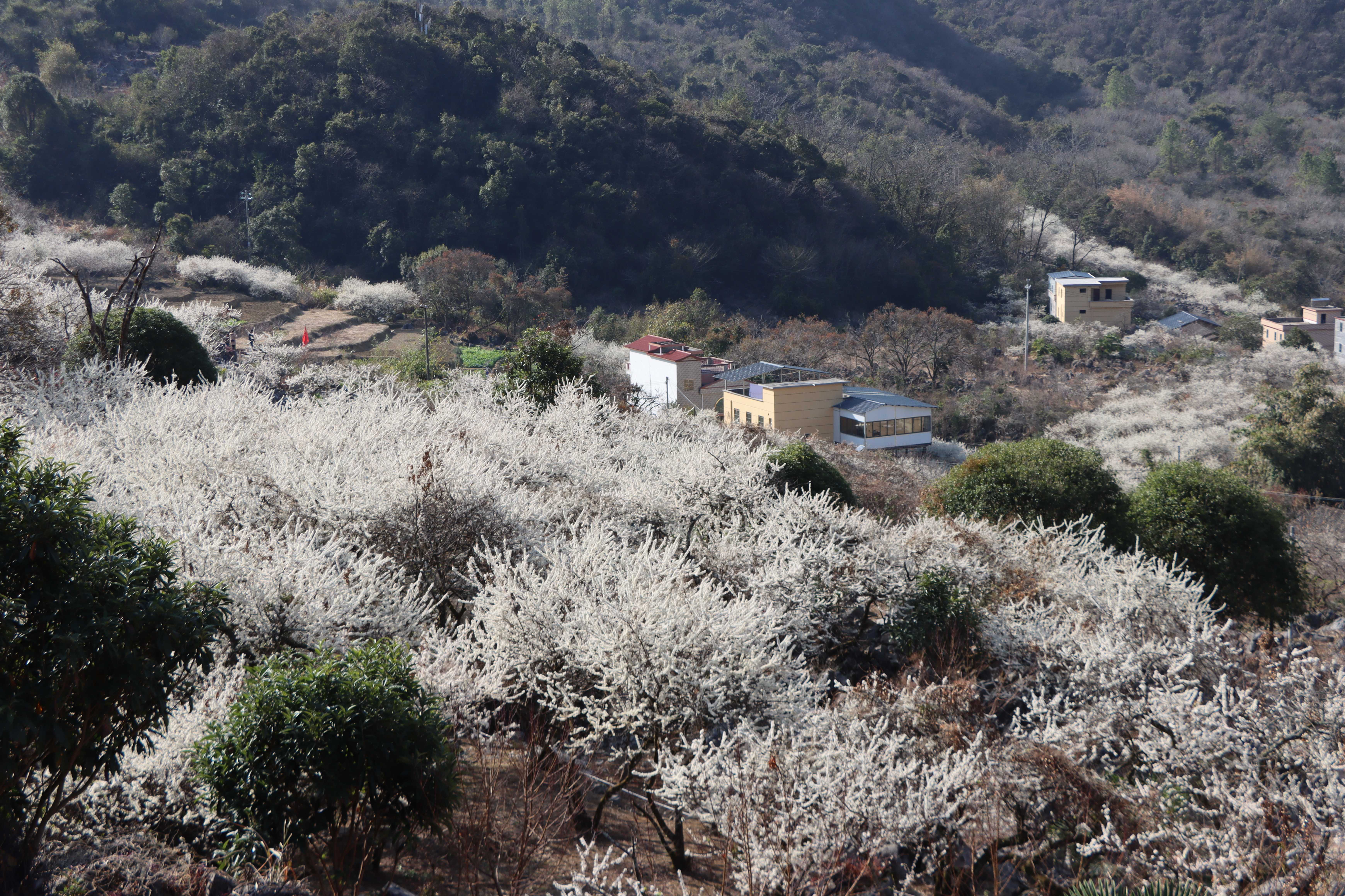 杨梅镇相关负责人介绍,水浪村小组耕地面积达千余亩,当地村民长期以李树种植为主要收入来源,历经多年精心培育,逐步形成近千亩李花种植规模,“千亩李花村”的美誉也随之传开。按照往年惯例,李花盛花期多集中在立春前后,今年因气温偏暖,花期提前了半个月,目前开花面积已接近三分之一,1月底将进入最佳观赏期。