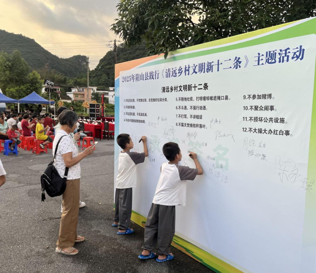 立村规民约,约出新风尚。阳山167个行政村(社区)均修订完善《村规民约》《红白理事会章程》,成立了村民议事会、红白理事会、道德评议会、禁赌禁毒会,充分发挥“一约四会”作用,大力倡导婚事新办、白事简办,摒弃高价彩礼、厚葬薄养、铺张浪费等不良社会风气,农村社会风气明显好转。秤架瑶族乡将“孝老爱亲、邻里友善、反对铺张浪费、抵制封建迷信”等核心内容纳入村规民约,以“小村规”撬动“大治理”。大崀镇松林村则将原来又长又拗口的村规民约巧妙编成了朗朗上口、好读易懂的“三字经”,成为村民内化于心、外化于行的文明指南。