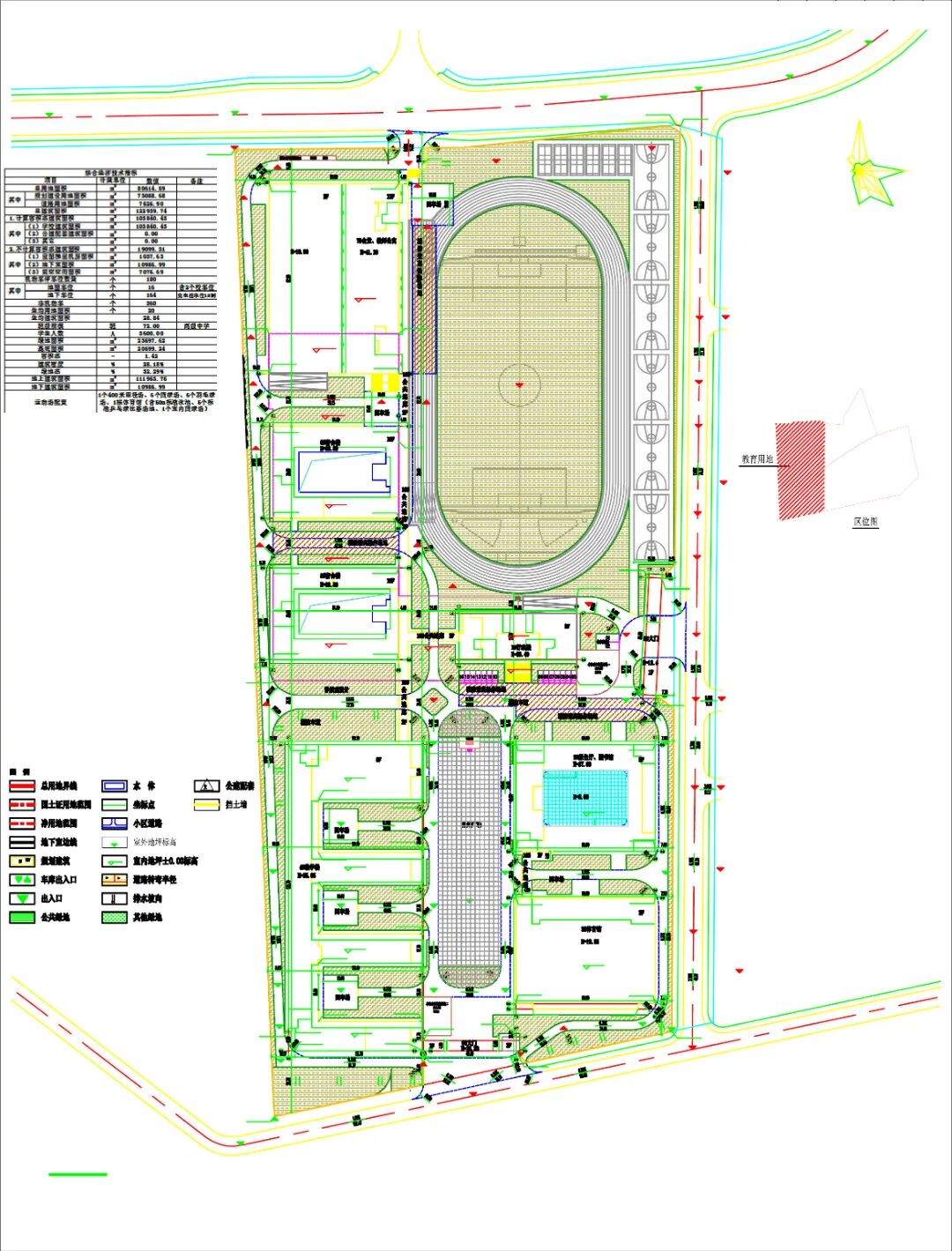 •项目配套包括1个400米田径场、6个篮球场、6个羽毛球场、1栋体育馆。体育馆内规划含60米标准泳池、6个标准乒乓球比赛场地和1个室内篮球场。