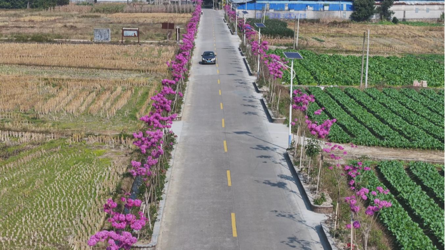 针对学田村段双车道这一核心通行路段,村里精选易养护的紫花风铃作为主导树种,按错落有致的原则打造约1.1公里特色花道,既美化环境,又吸引周边群众前来打卡。