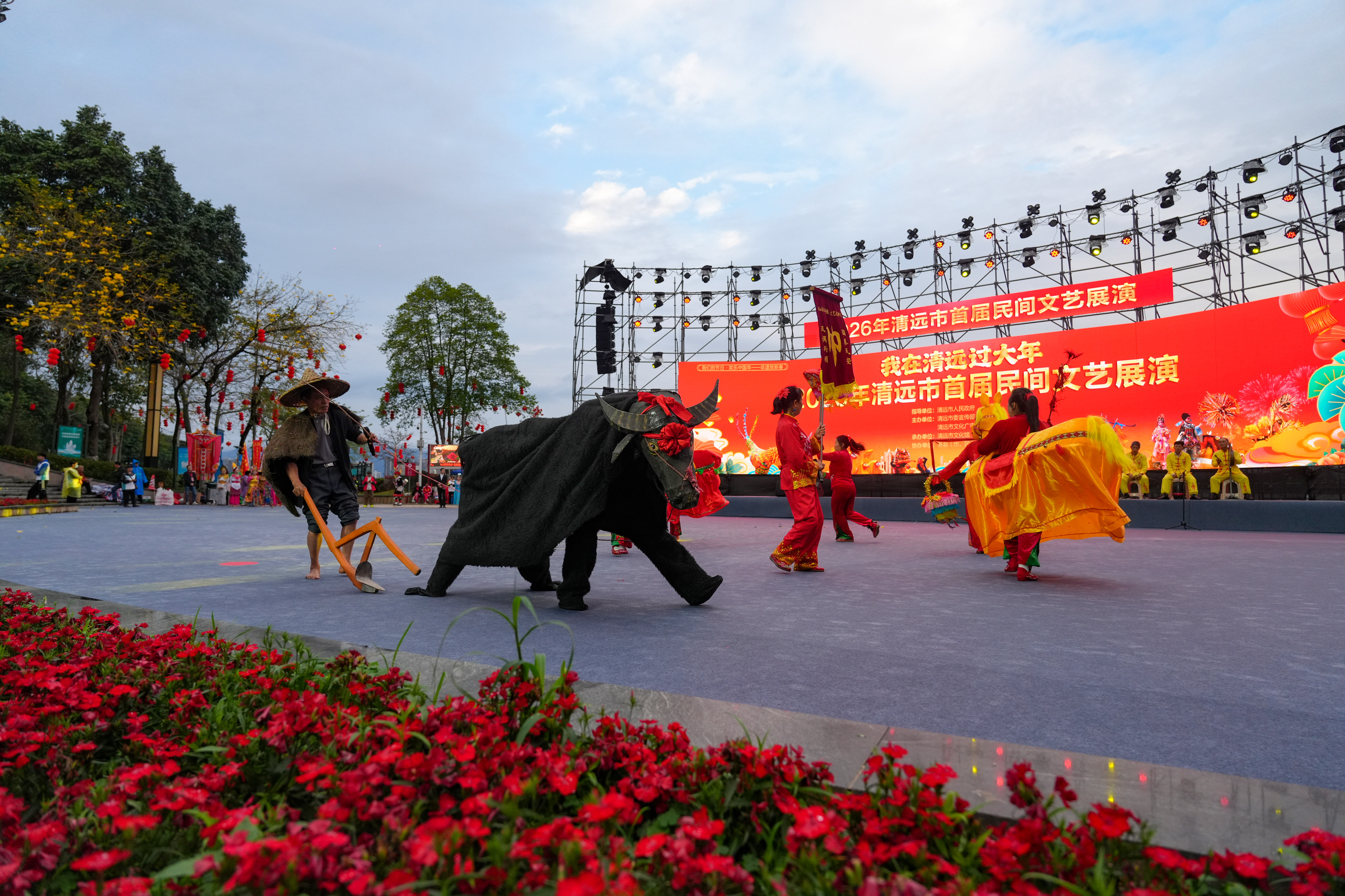 《舞春牛》。3月2日,2026年清远市首届民间文艺展演在江滨公园演艺广场举行。清远日报记者 邱炜民 实习生李为 摄