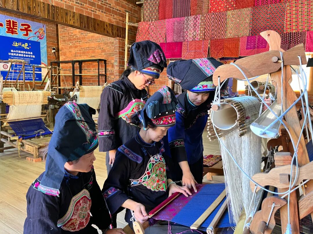 福堂镇积极探索闲置用地有效利用模式,通过用好“三地活化”策略改革工作经验,巧妙盘活10余栋乡村废弃住宅,让壮锦织造技艺在这片废弃住宅地上“活”起来。在省、市、县、镇四级共同发力下,通过政策、资金、人才等扶持,成功将合作社打造为一个集文化传承、技艺传习、民族服饰、特色美食、非遗民宿、研学旅游、文化展示于一体的壮瑶风采非遗旅游区。合作社通过聘请非遗传承人授课、建立标准化工坊、开发创新产品,让古老技艺重焕生机。通过与高校合作共建乡村振兴服务基地,输送高质量学生设计师团队与乡村织娘合作,每年输送研学生超过100人,通过多年的产学研相结合途径,间接带动村民致富奔康。