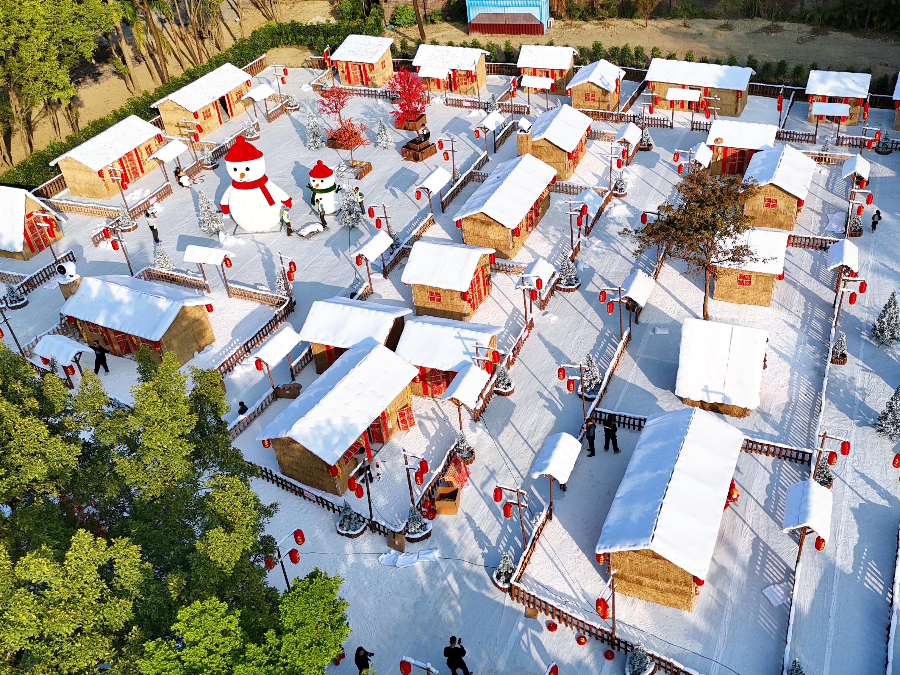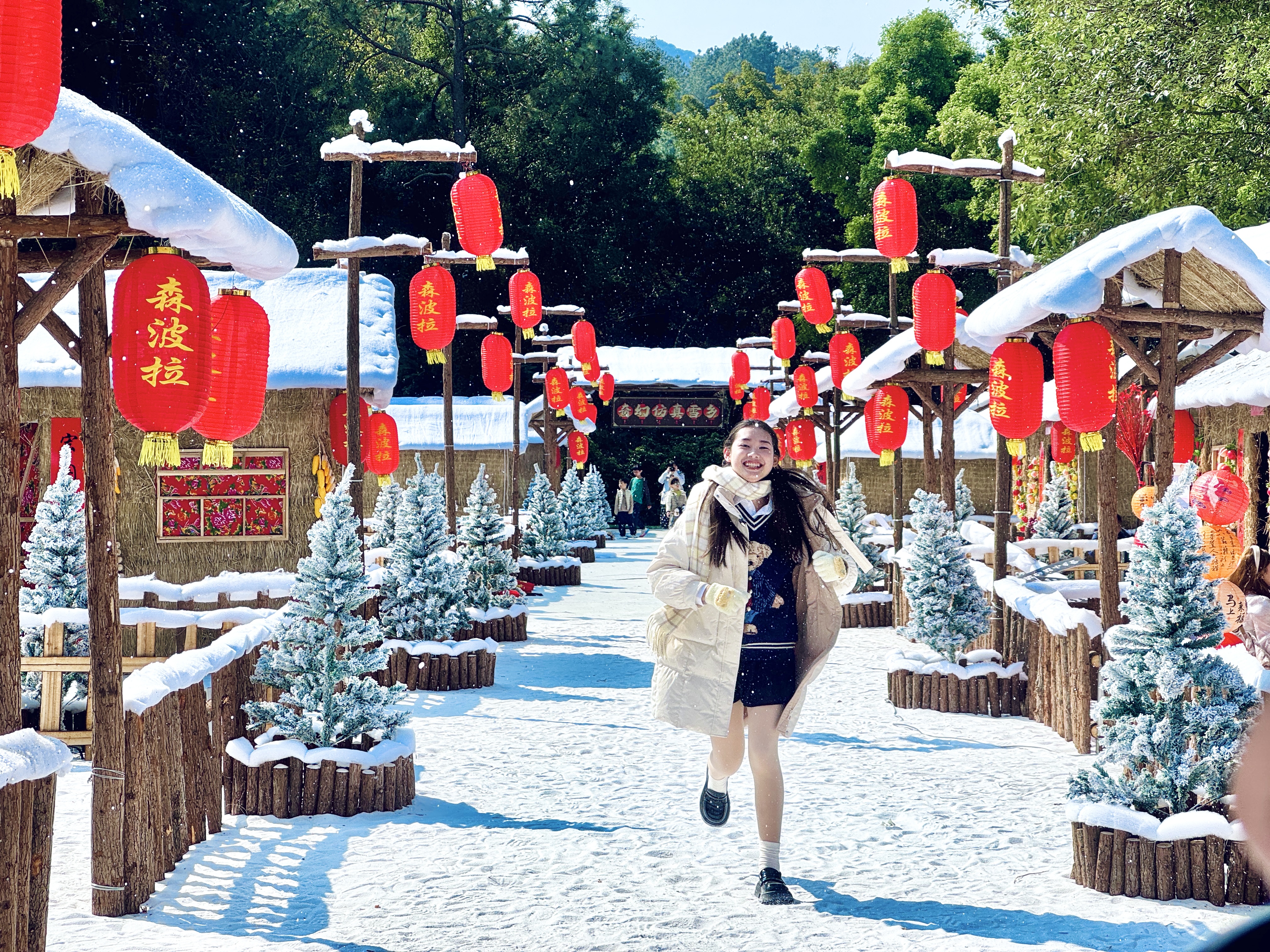 位于森波拉山湖林海之间的“奇幻仿真雪乡”占地3000平方米,于2026年2月1日正式对外开放,持续至2月28日。景区以原木小屋、皑皑“雪棉”、白砂雪地营造出纯美雪境,搭配栅栏、红灯笼与憨态雪人,窗沿悬挂的辣椒玉米更添生活气息。林间人工飘雪机定时扬“雪”,再现北方雪乡的经典场景,虽处岭南,却为游客编织出浪漫绝伦的冬日童话。