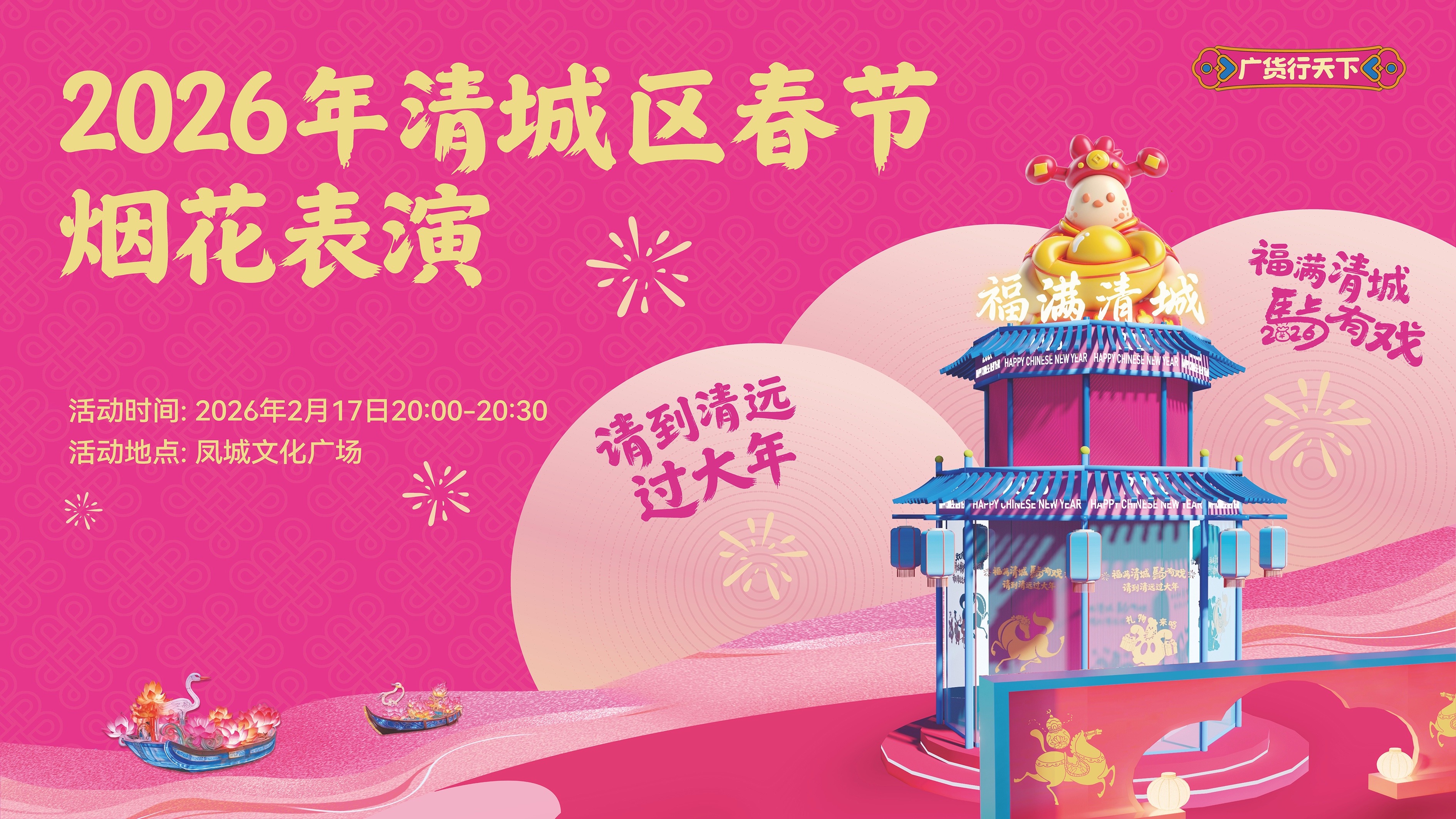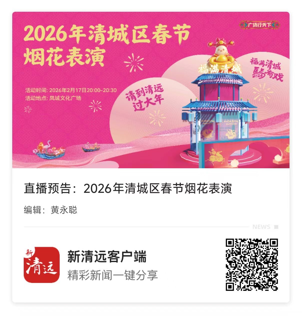 2026年清城区春节烟花表演将于今晚20:00-20:30精彩上演。
