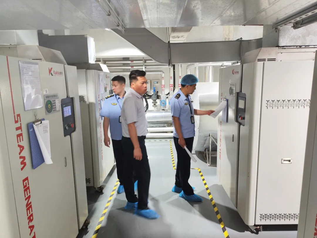 清城区应急管理局和清远市生态环境局清城分局执法人员检查企业锅炉设施。