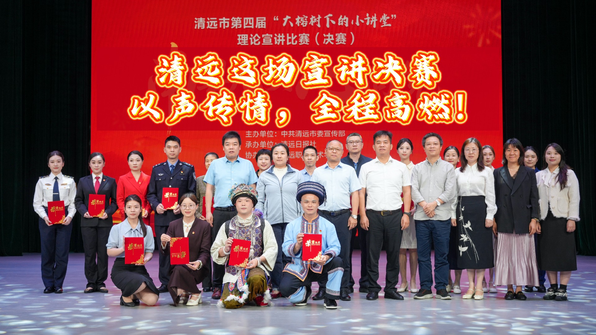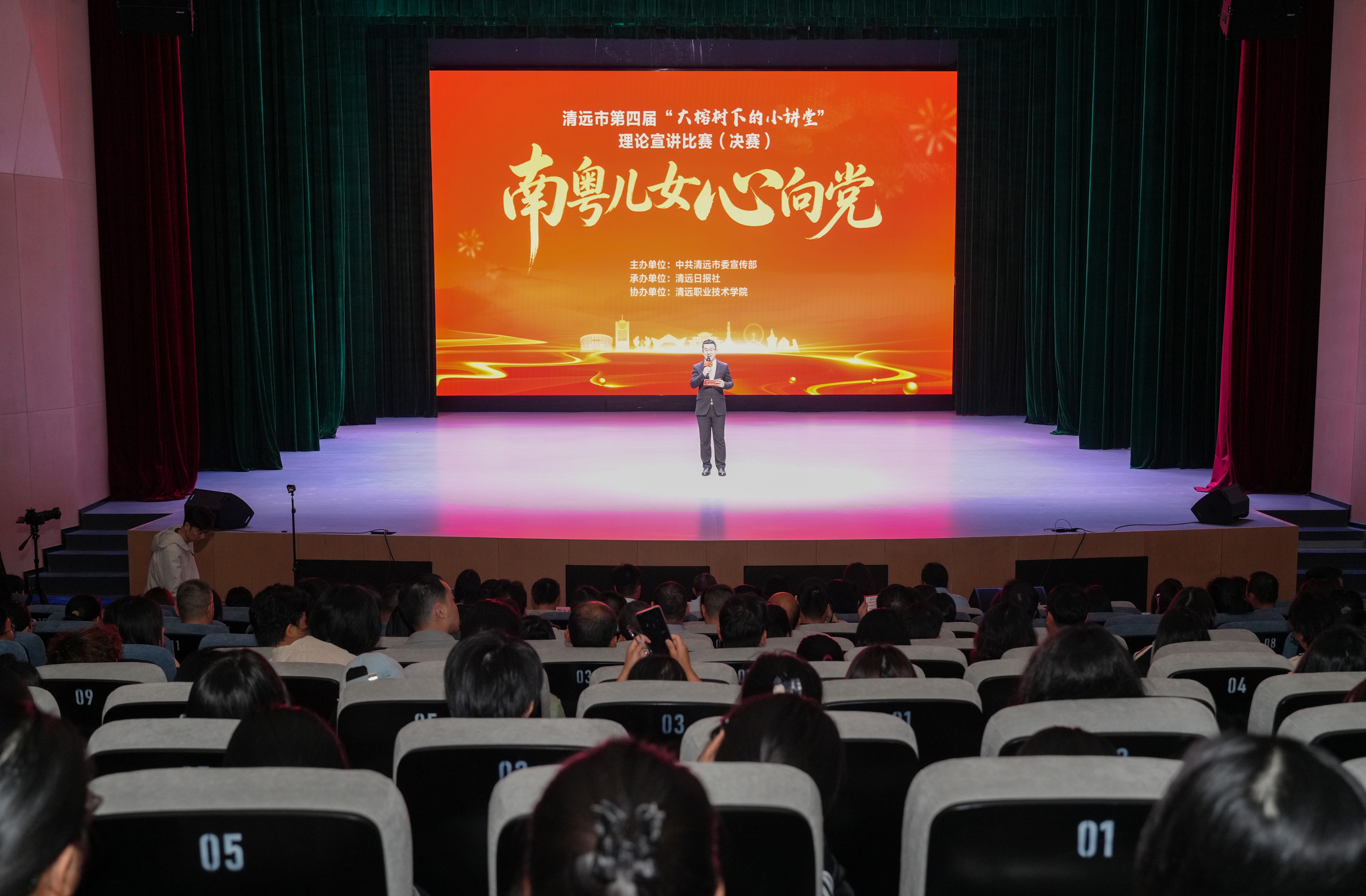 4月24日下午,由清远市委宣传部主办、清远日报社承办的清远市第四届“大榕树下的小讲堂”理论宣讲比赛决赛,在清远职业技术学院蟠龙剧院举办。活动自启动以来,经过层层选拔,最终12位来自全市不同领域、不同岗位的优秀宣讲员从众多参赛者中脱颖而出,会师决赛舞台,围绕“南粤儿女心向党”的主题,以例释理,以情动人,全程高燃!他们用生动的故事和真挚的情感,奉献了一场兼具思想深度、理论高度与情感温度的理论宣讲盛宴,也为清远职业技术学院青年学生上了一堂别开生面的思政大课。