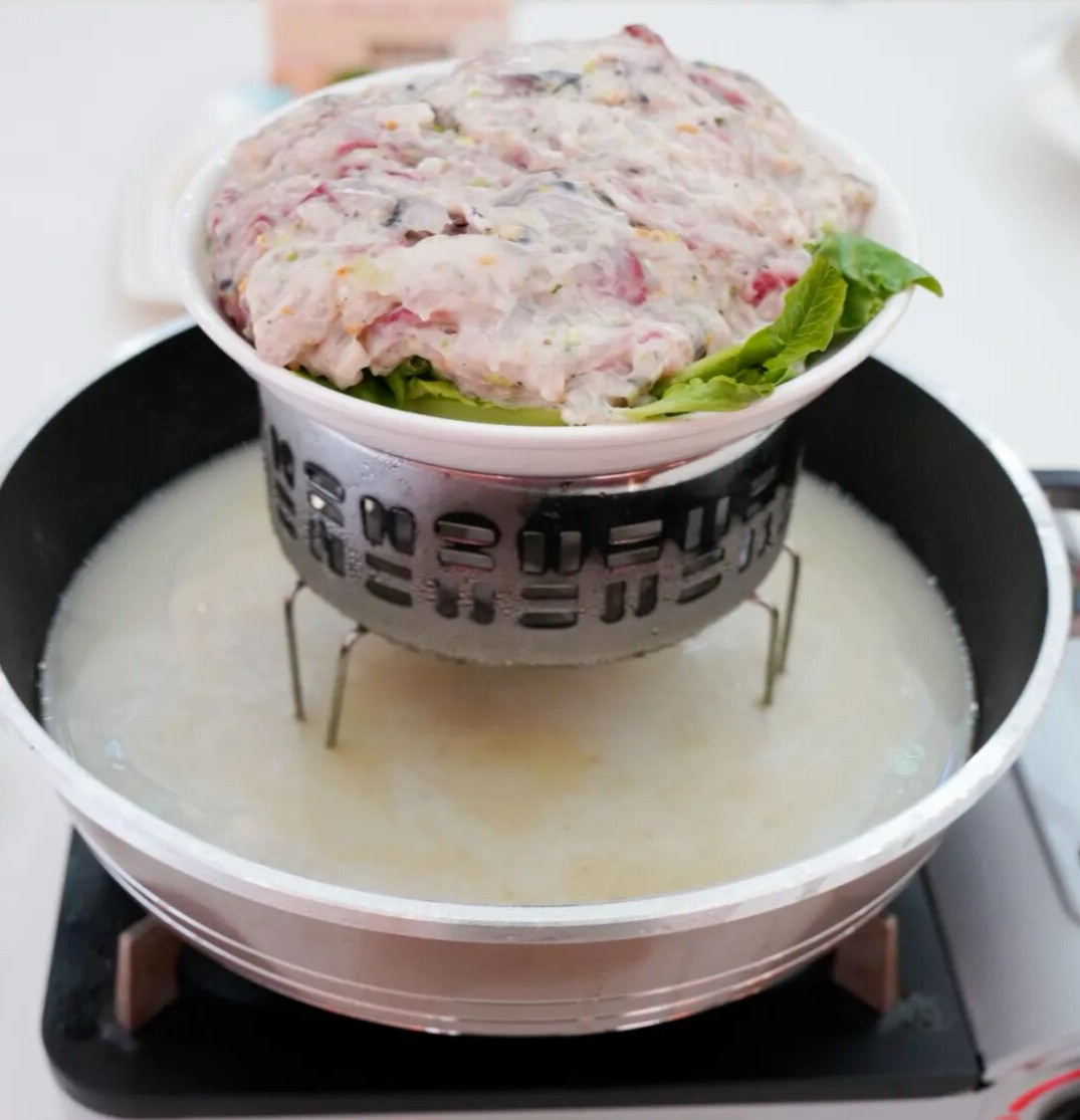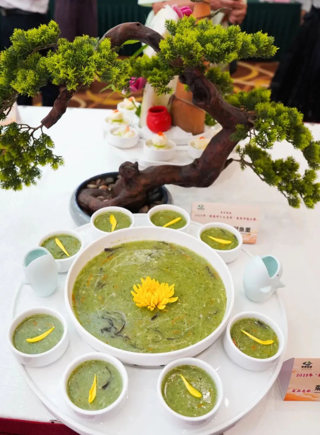 菊花擂茶河鱼羹融客家擂茶之韵、河鲜之味与菊花之雅于一体。精选鲜嫩河鱼,佐以传统擂茶汤底,再点染可食菊花瓣。其味集鲜、香、醇、雅,既承传统饮食的质朴本真,又添自然花香的灵动清逸,成就一道风味卓然、滋养身心的风雅之味。