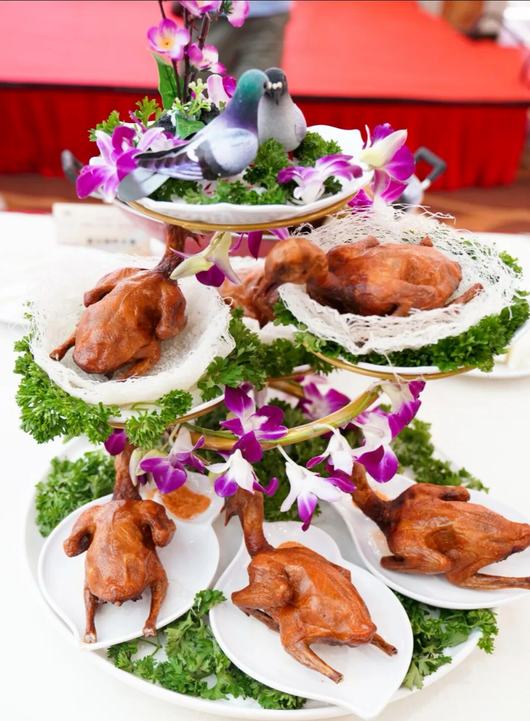 山海:“山”代表山林珍品麻竹笋,“海”代表海中珍鲜鲍鱼。凤凰:中国传统文化中常以“凤凰”比喻珍禽,这里指代品质上乘的“清远鸡”。琼瑶:美玉之意,形容洁白的麻竹笋片,也暗喻整道菜品的珍贵与晶莹剔透的质感。突出食材本味,强调汤鲜味醇,口感层次分明(鸡的嫩滑、鲍的弹韧、笋的脆嫩),通过精心煨烩使三者精华融合。