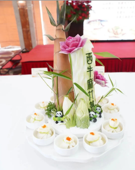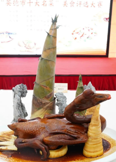 石榴在中国文化中象征多子多福、团圆美满,这道菜以石榴为造型,寓意吉祥富贵。英德西牛镇盛产麻竹笋,其笋体肥大、肉质鲜嫩、纤维少,是“富贵石榴笋”的主要食材,也是清远五大百亿农业产业IP之一。