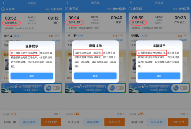 记者了解到,广州地铁还针对白云机场三座城际铁路车站的指引服务进行了优化,为方便旅客辨识白云机场三个航站楼、避免“误乘误下”,在铁路12306系统购票界面上线了提示功能。旅客在购买出发或到达城际白云机场东站(T3)、白云机场南站(T1)、白云机场北站(T2)的车票时,系统将在支付前自动弹出提示框,提醒所对应的具体航站楼信息。
