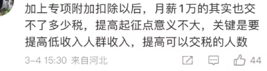 岳希明在文中提到,目前我国个税基本减除费用标准并不低。其次,我国因基本减除费用较高,相当一部分中低收入人群无需缴纳个税,在这种情况下,如果再提高个税基本减除费用,可能会出现本就不缴个税的低收入群体并不受益,而中高收入群体降税效应更明显等情况,将弱化个税的收入分配调节功能。再次,过高的个税基本减除费用,会限制我国个税筹集税收收入的能力。