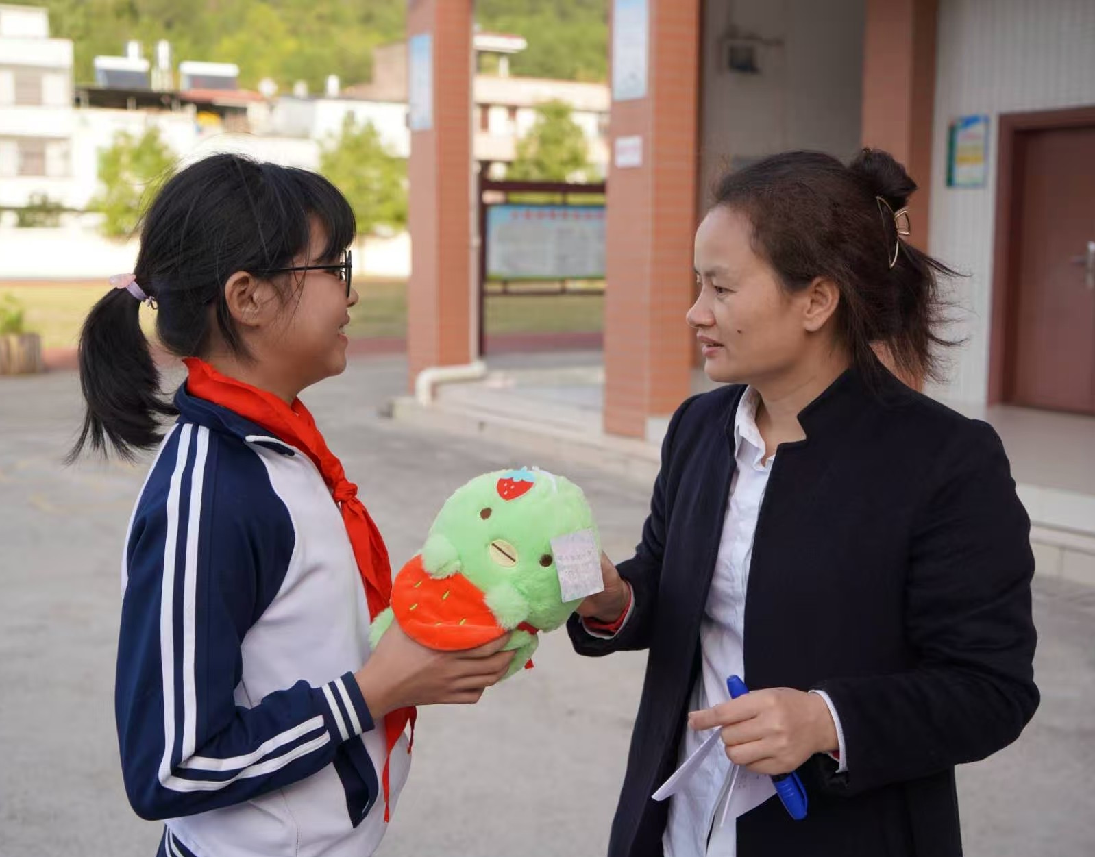 梁冬慧(右一)把活动奖品发给同学。