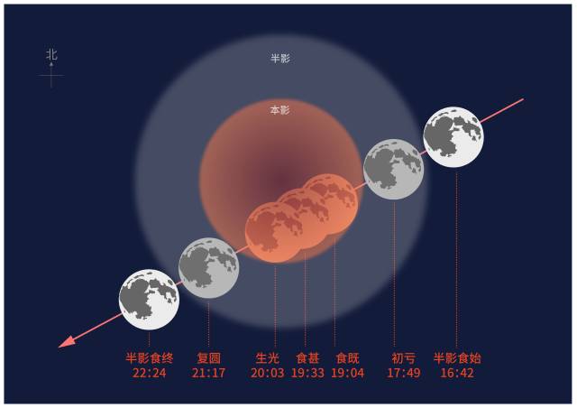 北京时间16时43分,半影开始,月球边缘与地球半影开始接触,我国只有东北最东等少数地区可以看到;对于我国大部分地区来说还看不到。