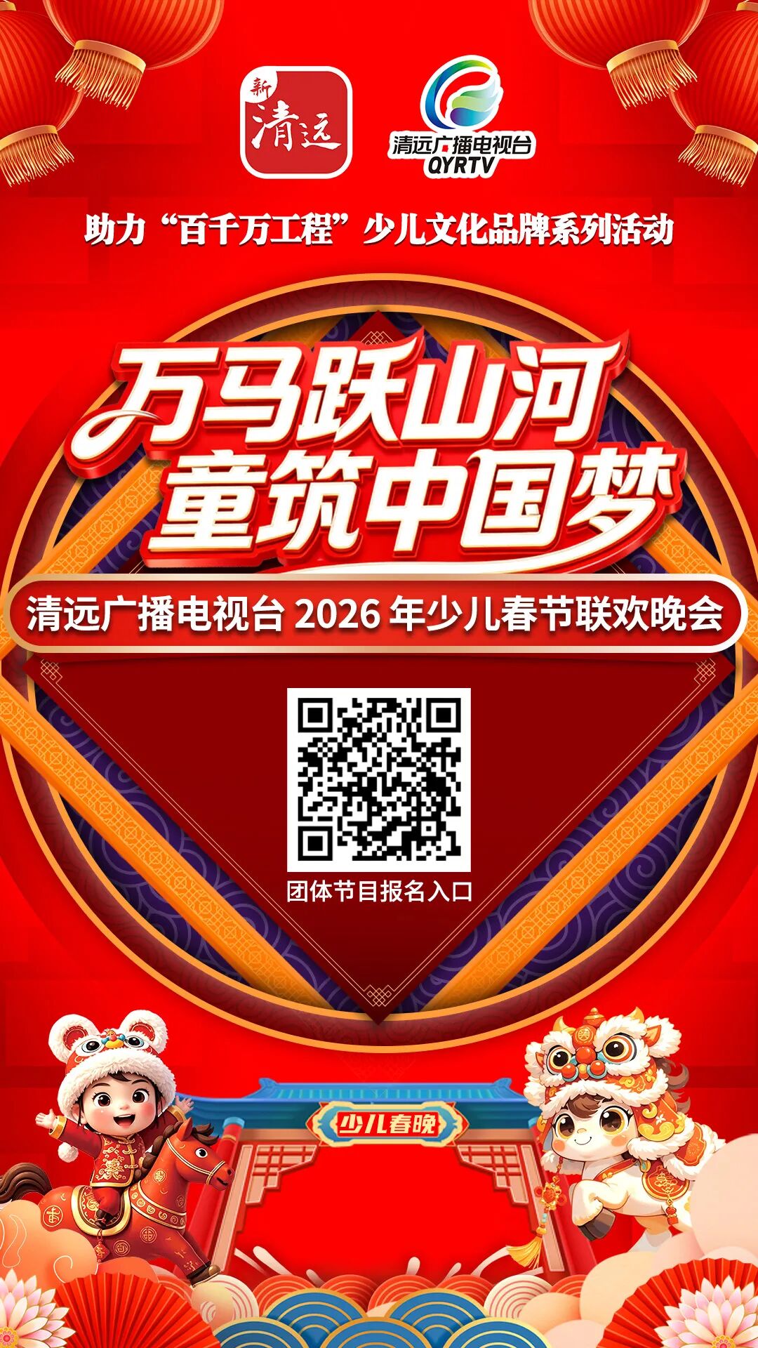本届少儿春晚由清远市关心下一代工作委员会、清远市教育局、共青团清远市委员会联合指导,清远广播电视台主办,以“万马跃山河·童筑中国梦”为主题,为全市中小学、幼儿园及培训机构搭建起高水平的交流舞台,开启党媒助力少儿文艺发展的新篇章,也成为“百千万工程”少儿文旅系列活动中不可或缺的重要一环。
