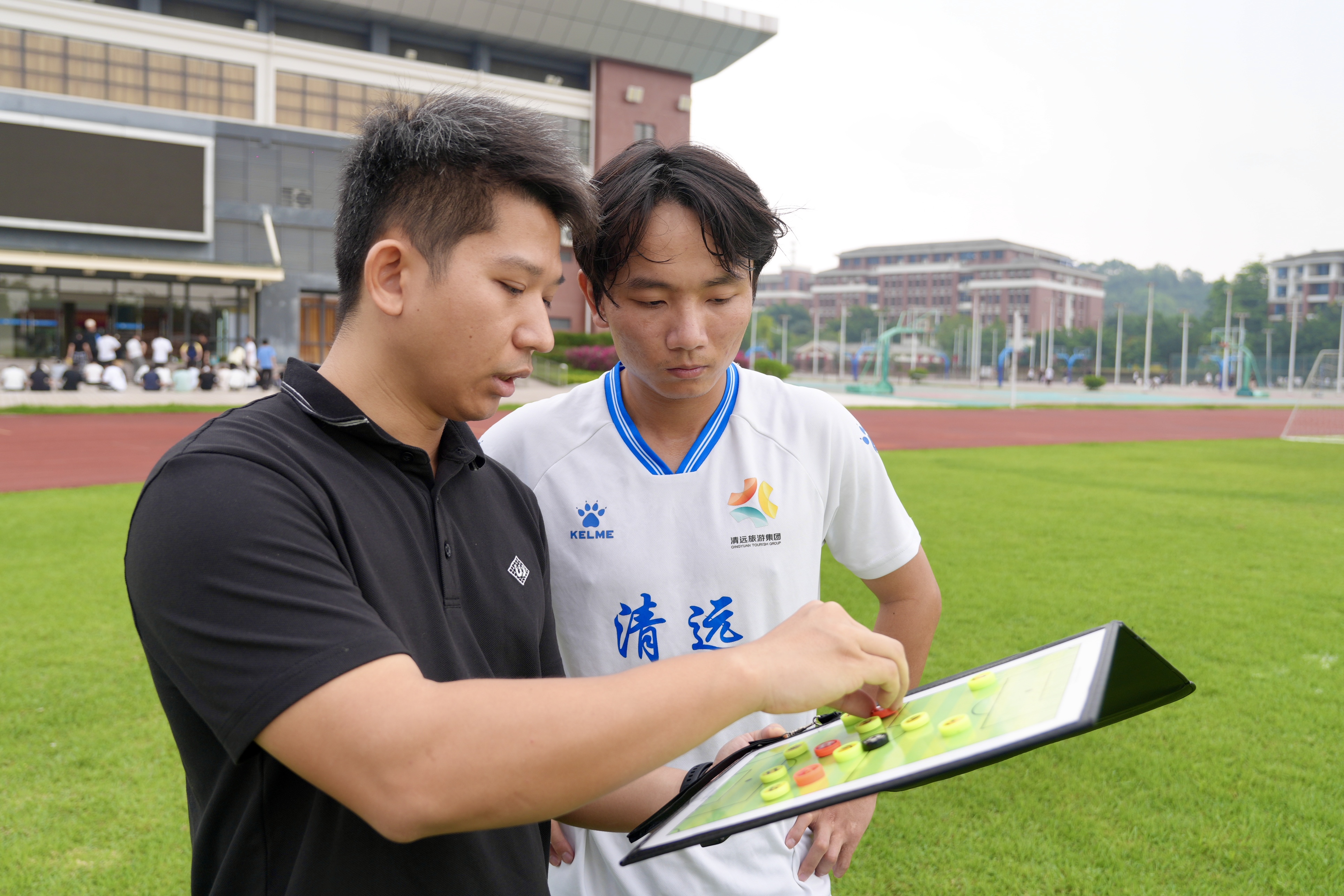 学校足球队教练陈家兴与黄宏熙交流战术。清远日报记者 邱炜民 摄