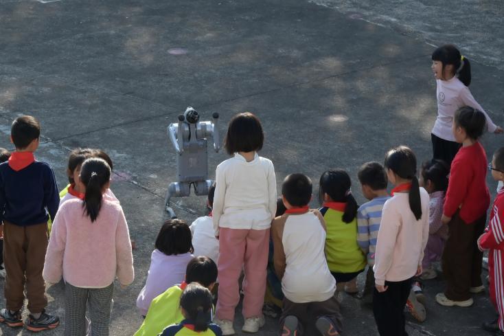 活动现场最吸引孩子们的是科技展示环节。该校大数据与人工智能学院学生党支部带来了宇树科技机器狗和大疆无人机等先进设备,机器狗灵活完成行走、翻滚、跳跃等动作,无人机在空中精准飞行并展示高难度技巧,引来孩子们阵阵惊叹。表演结束后,孩子们还近距离观察和接触这些设备,亲身体验科技的神奇魅力。科技展示之余,广东金融学院教工党员、大学生们还与鲤鱼小学的孩子们一起开展了跳绳、踢毽子等体育活动,在欢声笑语中拉近与小学生之间的距离。