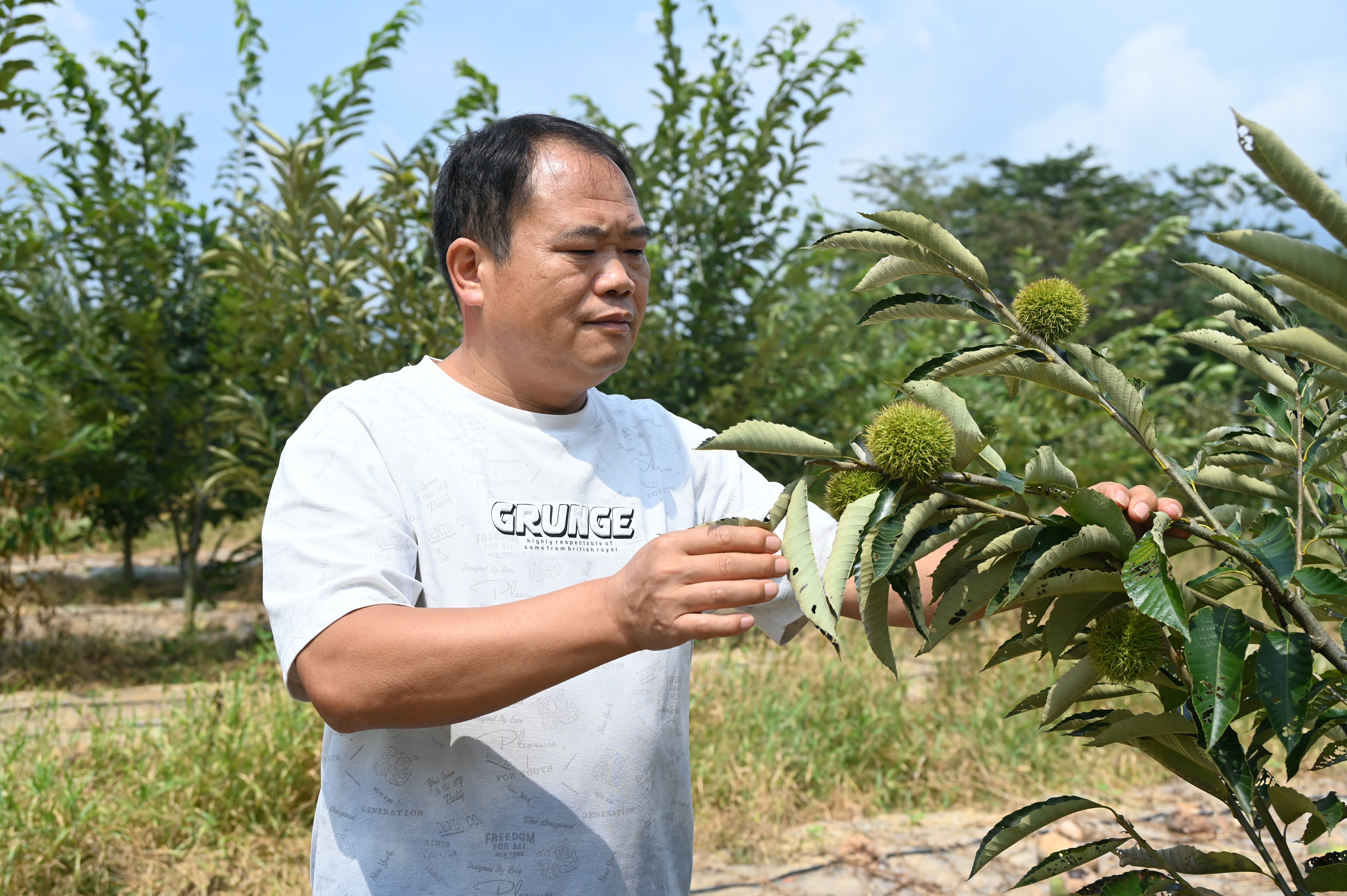 “这片‘中优1号’板栗是2023年种植,今年首次挂果,预计中秋左右就能采收,能收15万斤鲜果。”在果园巡查的公司负责人邓志强介绍,再过两年,这片板栗树便进入盛果期,届时每亩产量可达1500斤,产业前景可观。