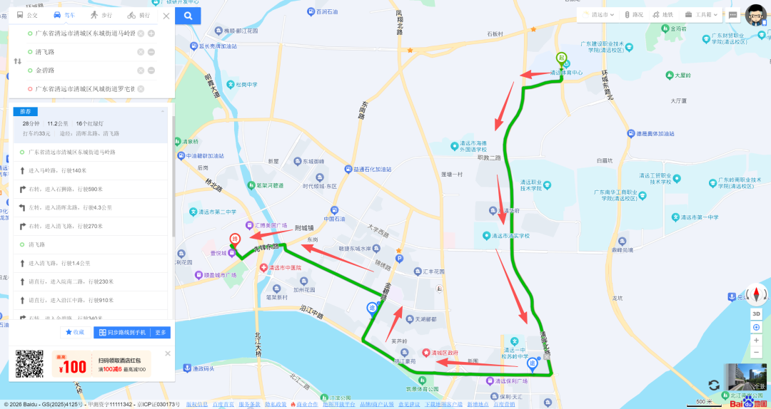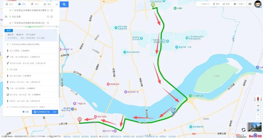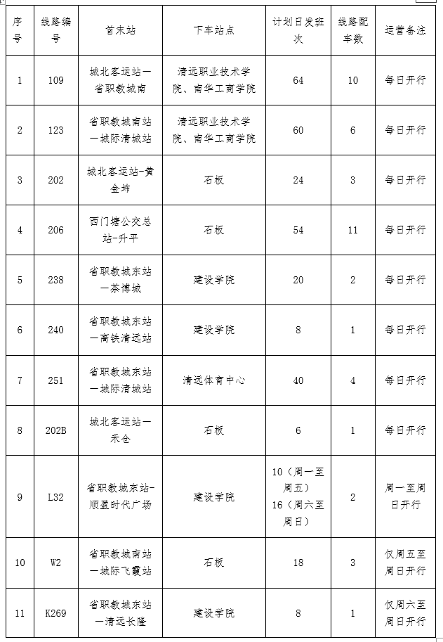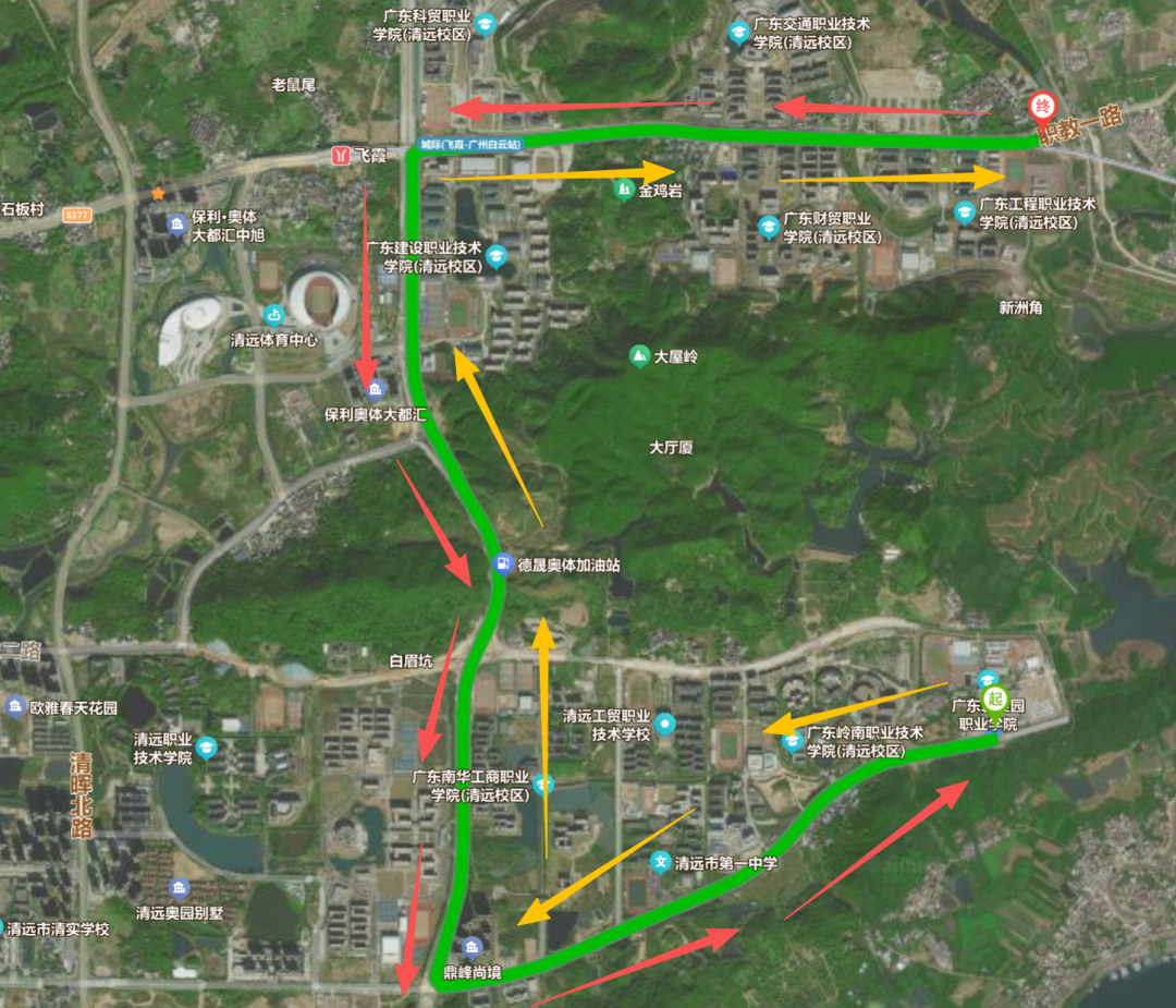 目前,清远市体育中心(省职教城核心区域)周边共覆盖11条常规公交线路,串联城北客运站、城际清城站、城际飞霞站、高铁清远站、顺盈时代广场等主要交通枢纽及商圈。