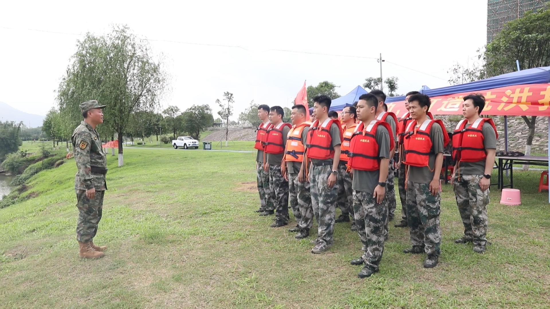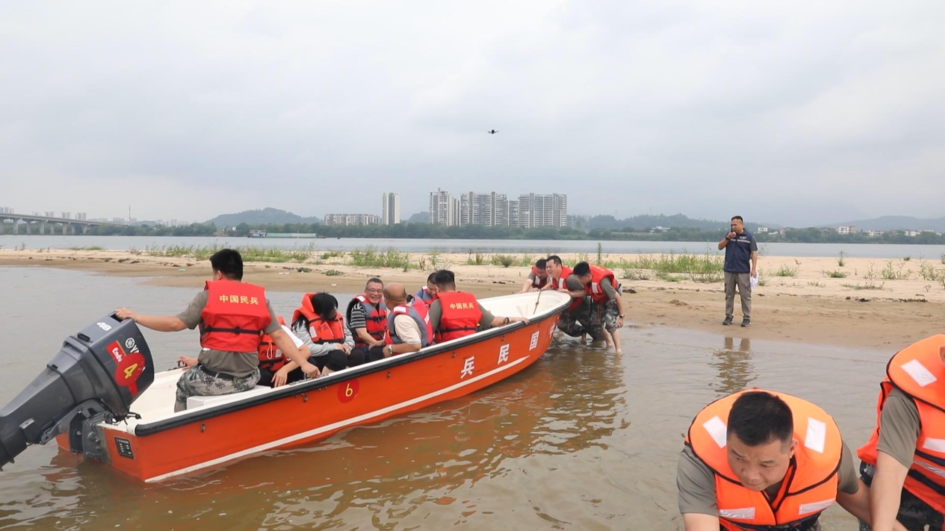 伦洲岛三面邻江、地势低洼,水流情况复杂。目前,岛上常住居民约800人。本次演练模拟因连续强降雨导致河道水位上涨,伦州岛内居民需要转移的场景,集结了60多名民兵、8人无人机分队,轻舟5艘、橡皮艇1艘等装备。
