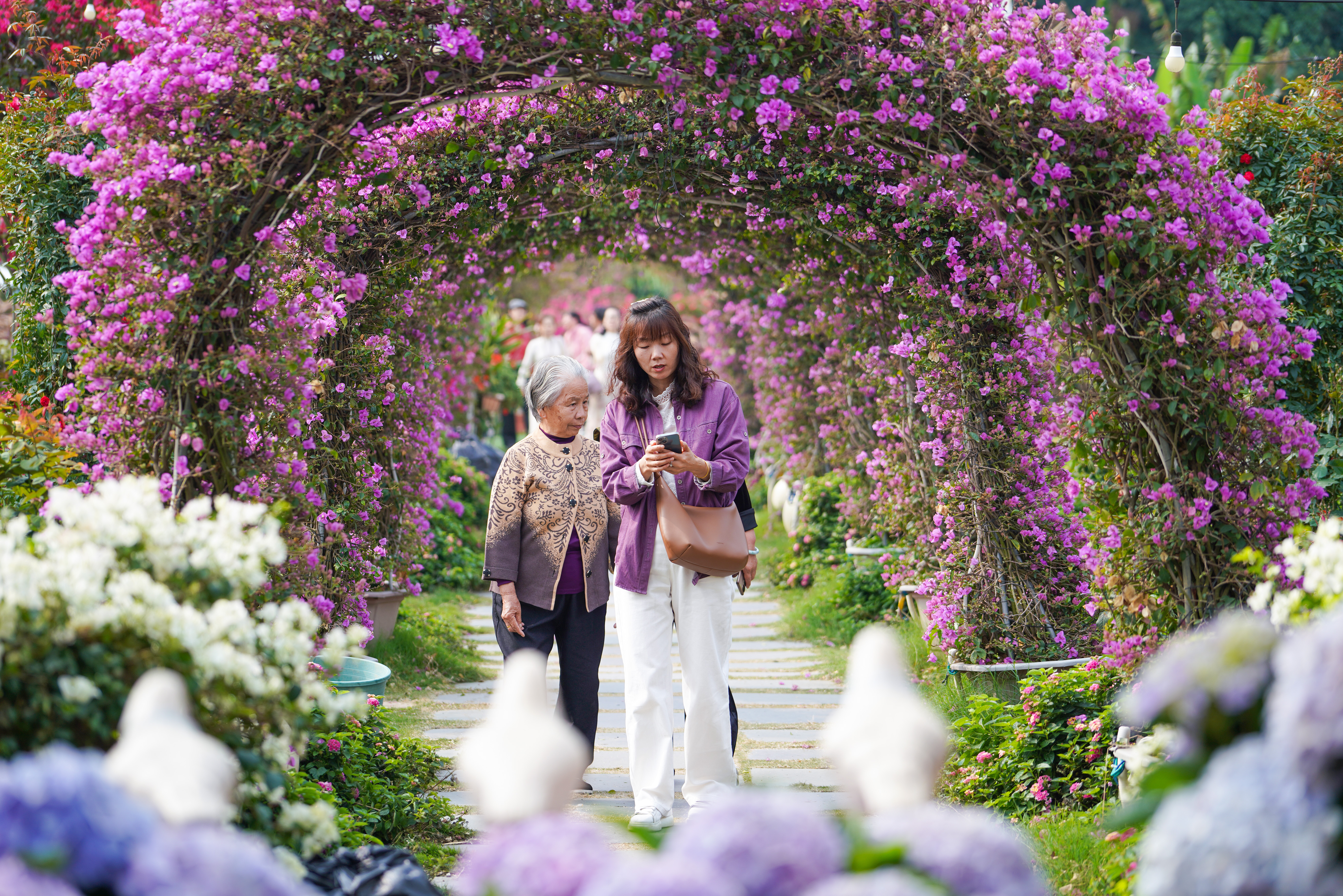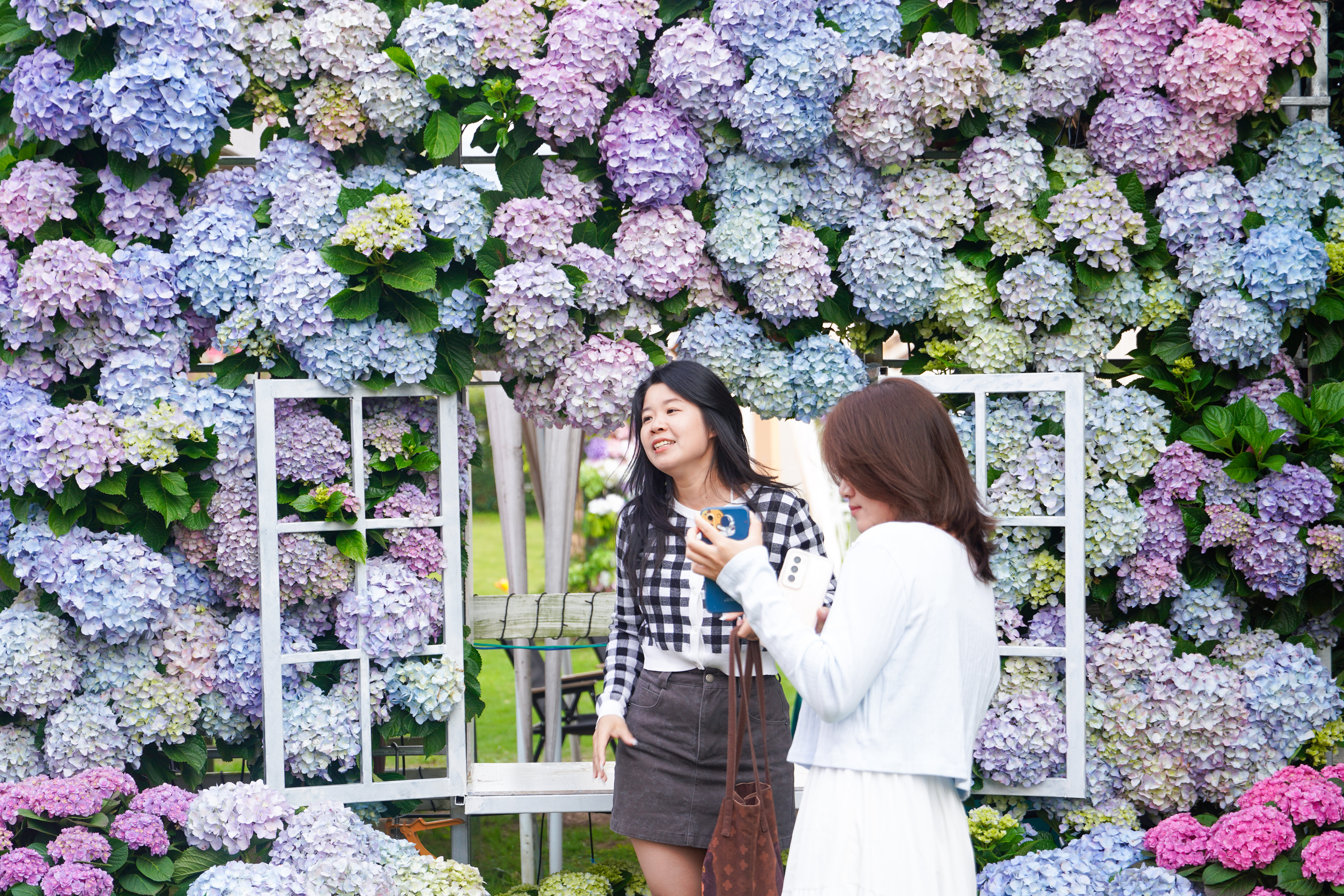 花卉庄园里,绣球花开成了梦幻海洋,蓝、紫、粉、白团团相拥,堆成浪漫花墙与花径,一步一景宛若闯入油画。各色花卉相伴盛放,香气氤氲,不用滤镜,随手一拍便是氛围感满满的春日大片。