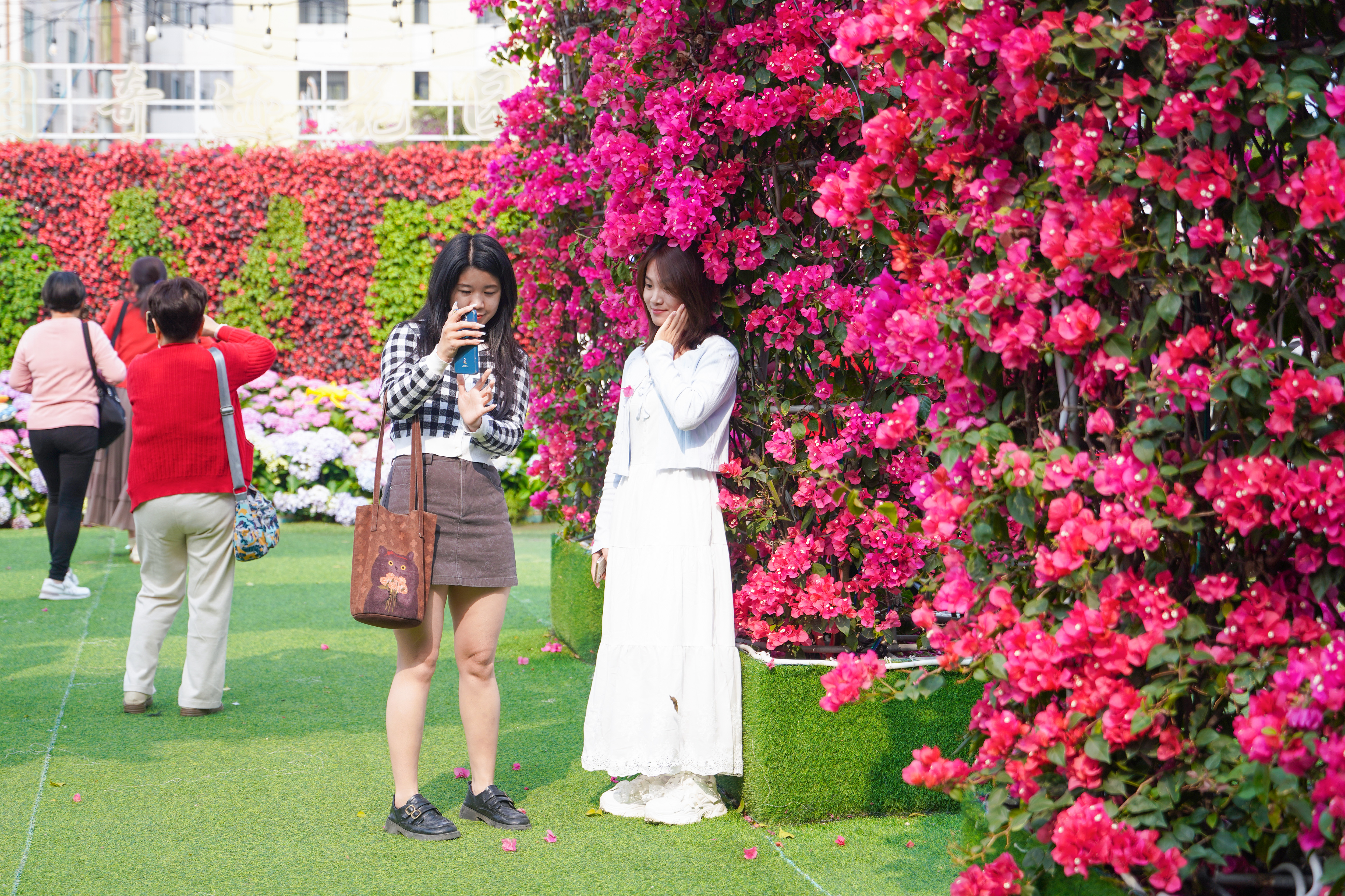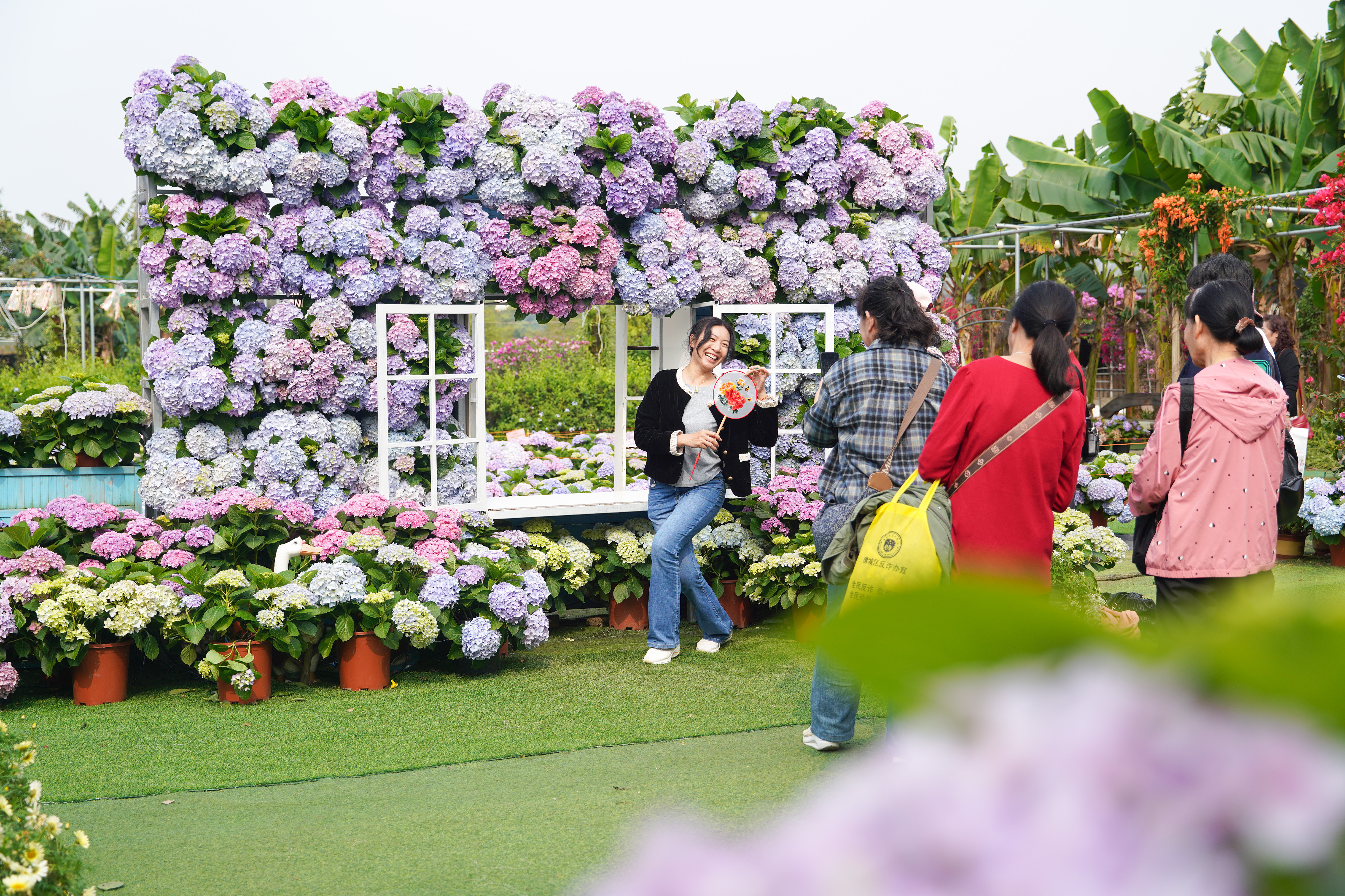 3月9日,清远花卉庄园,游客在绣球花墙前拍照打卡。清远日报记者 刘淑芳 摄
