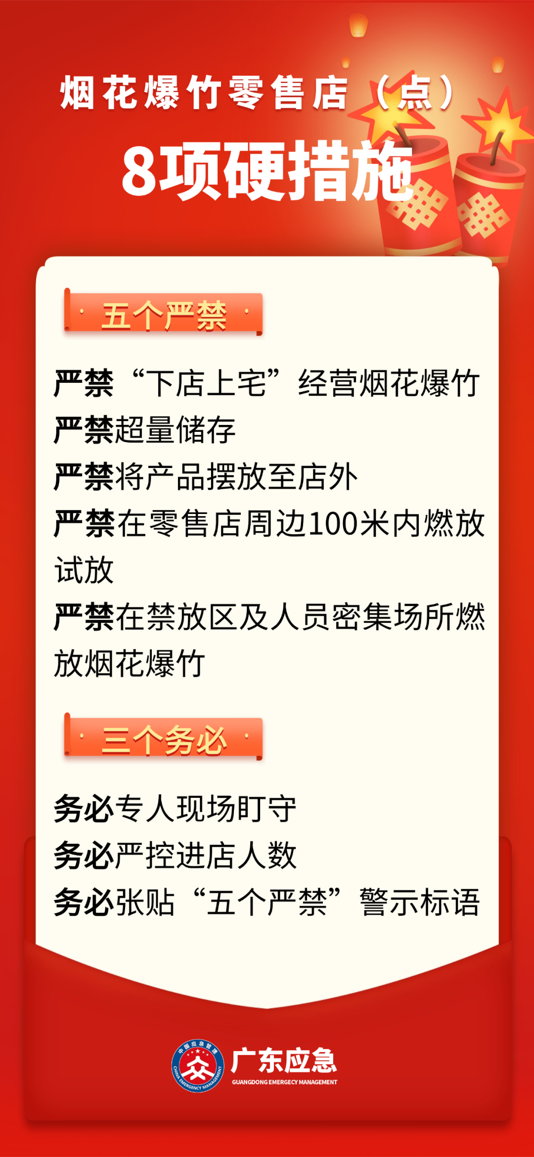 新春佳节平安过节,安全第一!烟花爆竹零售店(点)“五个严禁、三个务必”请收好↓↓↓“五个严禁”一、严禁“下店上宅”。二、严禁超量储存。三、严禁将产品摆放至店外。四、严禁在零售店(点)周边100米内燃放试放。五、严禁在禁放区及人员密集场所燃放烟花爆竹。“三个务必”一、务必专人现场盯守。二、务必严控进店人数。三、务必张贴“五个严禁”警示标语。来源:广东应急管理 订阅后可查看全文(剩余80%)