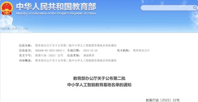 根据《教育部办公厅关于开展第二批中小学人工智能教育基地推荐工作的通知》(教基厅函〔2025〕15号)要求,经各省教育行政部门推荐、教育部集中公示等环节,最终确定了第二批中小学人工智能教育基地325个。其中,广东有10所学校入选——