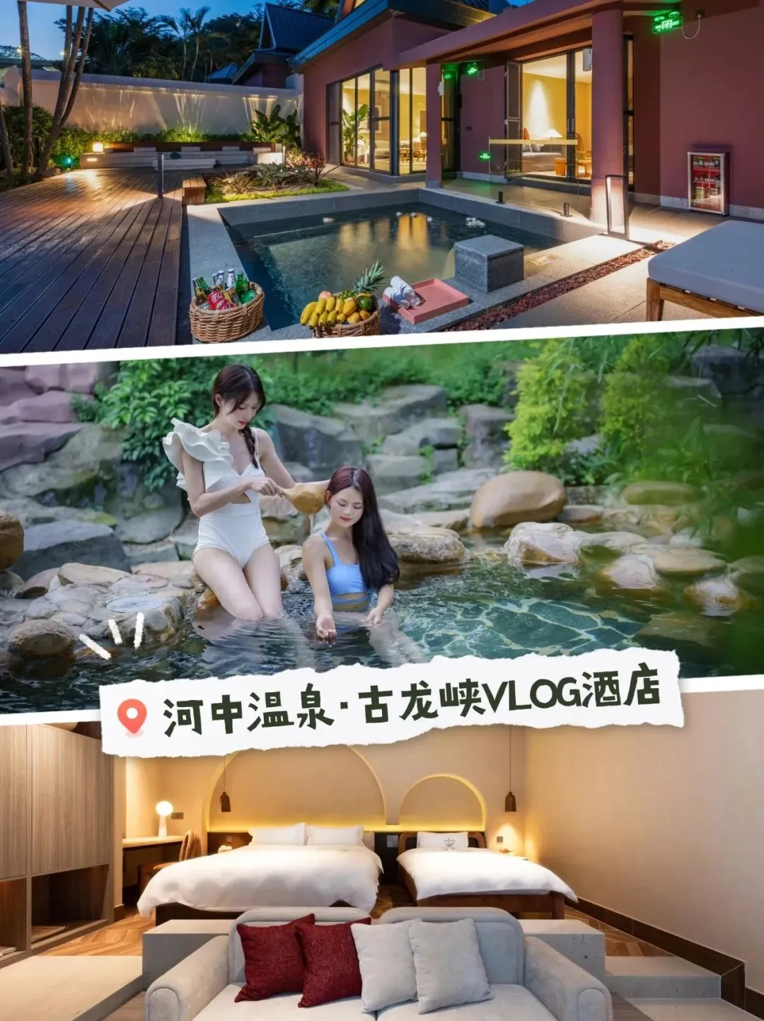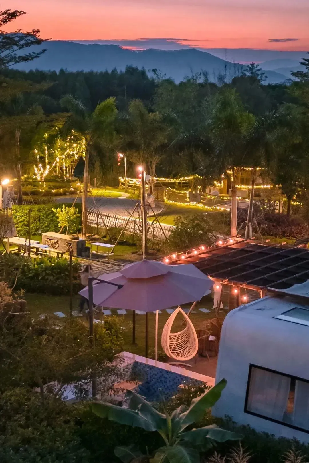 6000平方米园林内,三幢风情建筑与汤泉池、篝火广场错落分布。民宿共有12间原木色系客房,透过全景落地窗可将山景尽收眼底。