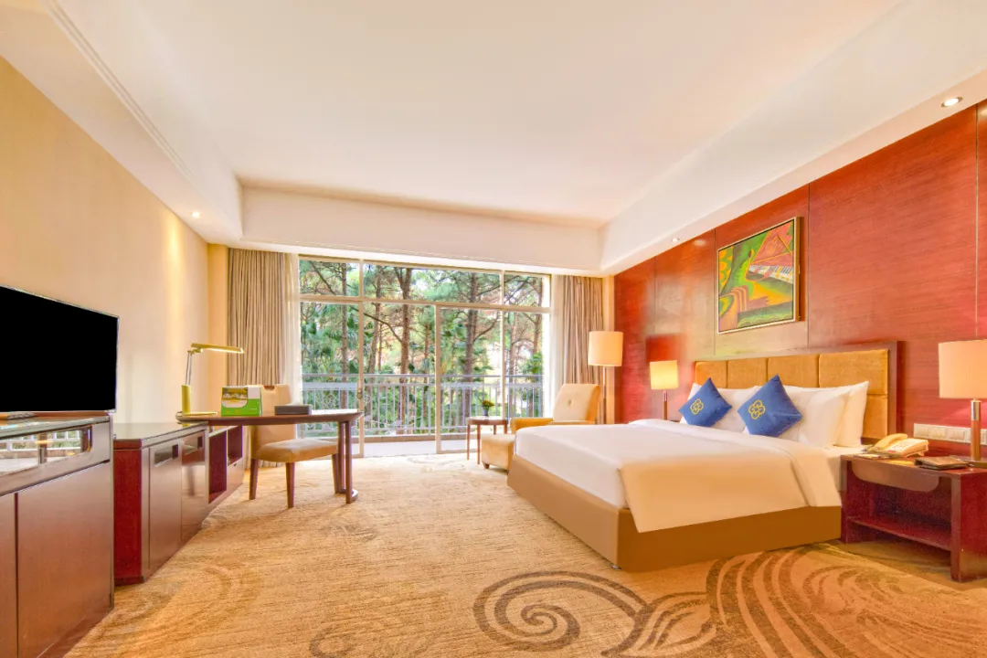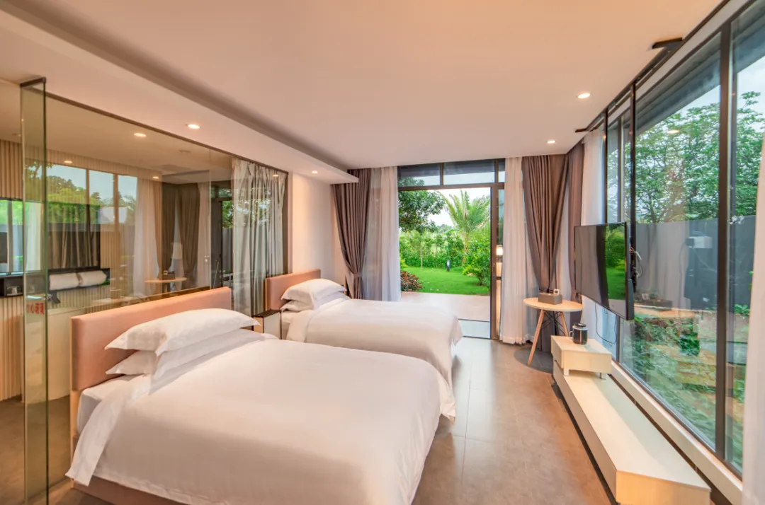 酒店以生态园林为主题,山水交映。室内设计遵循“自然为本”的建筑理念,处处弥漫着原山、原水、原生态的人文气息。酒店拥有418套客房,每间客房都有一个独立的阳台景观,融合“自然与智能”的现代设施,为游客打造舒适的住宿体验。