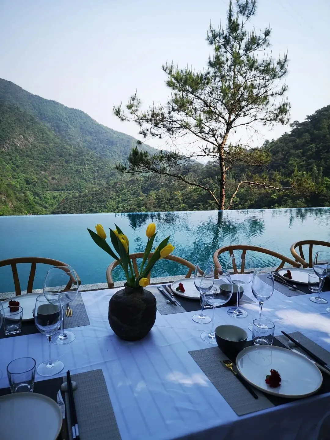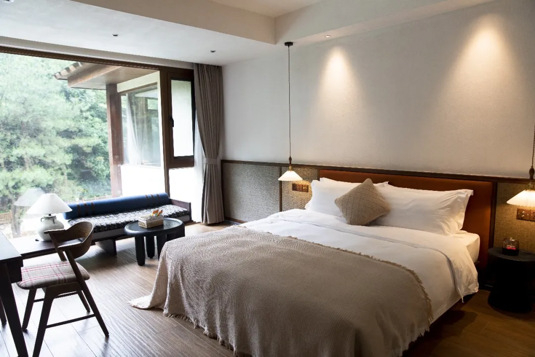 民宿以国风侘寂美学为设计核心的度假庭院,竹林、溪流和连绵山峦环绕民宿,推窗即见水墨画般的自然景观。客房主要分为三类,私汤泡池房、全景浴缸房、雅致基础房。
