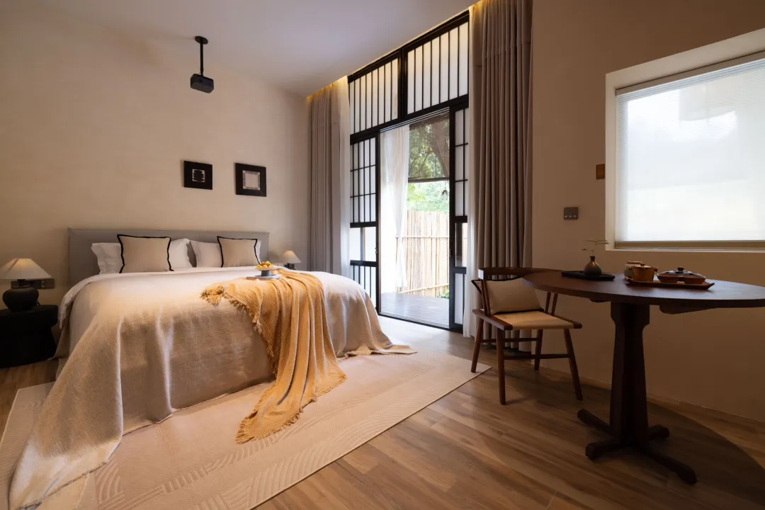 房间设计以儒雅侘寂风为主,建有舒适的花园小院,主打亲近自然、休闲娱乐的度假打卡地。