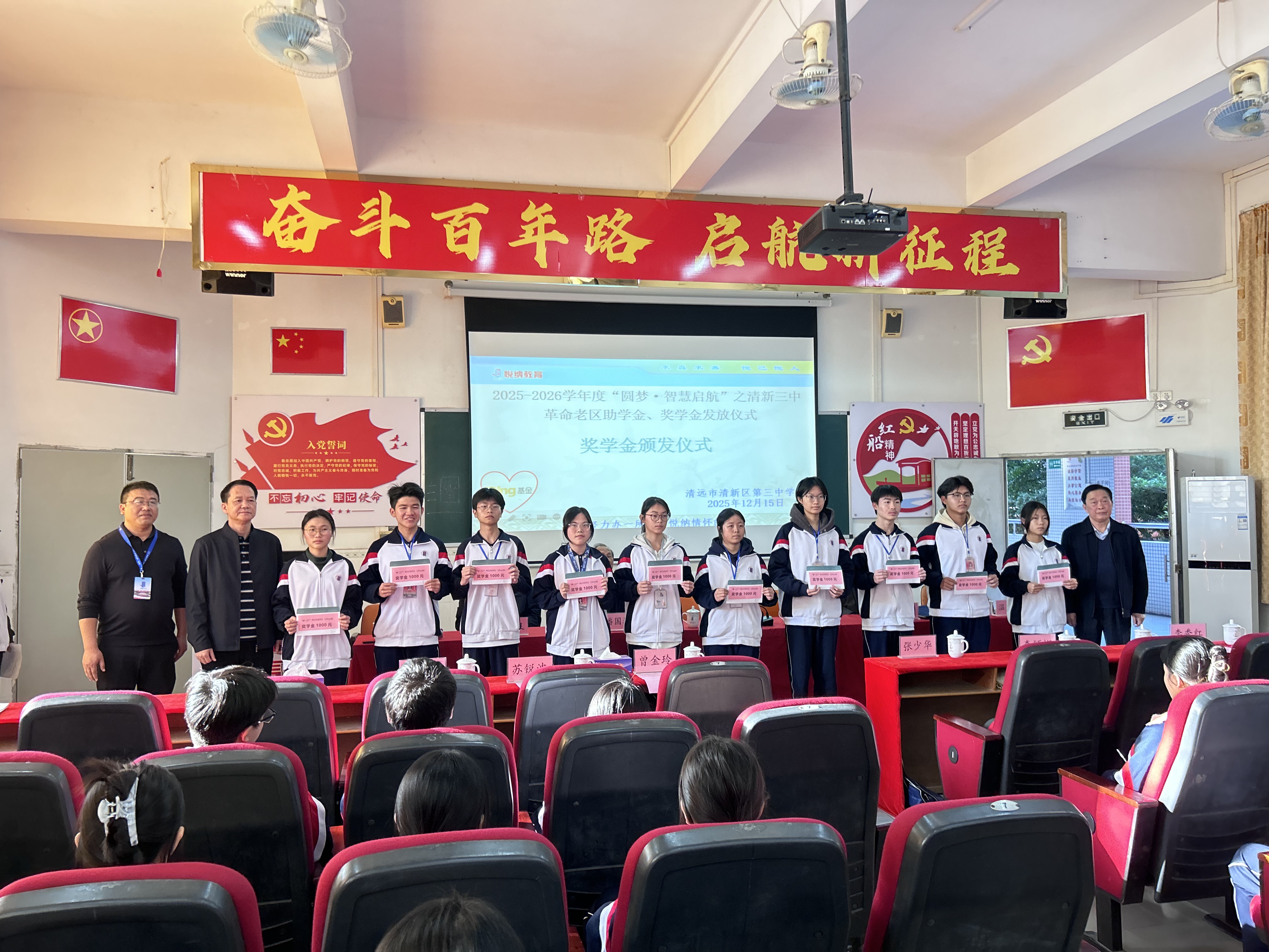 12月15日下午,清远市老促会携手清远农商银行公益基金会在清新区第三中学举行“圆梦·智慧启航”之清新三中革命老区助学金、奖学金发放仪式,为50名困难学子、15名优秀学子发放共11.5万元助学金、奖学金。这是该项目第9年走进清新三中对革命老区学子进行助学、奖学。