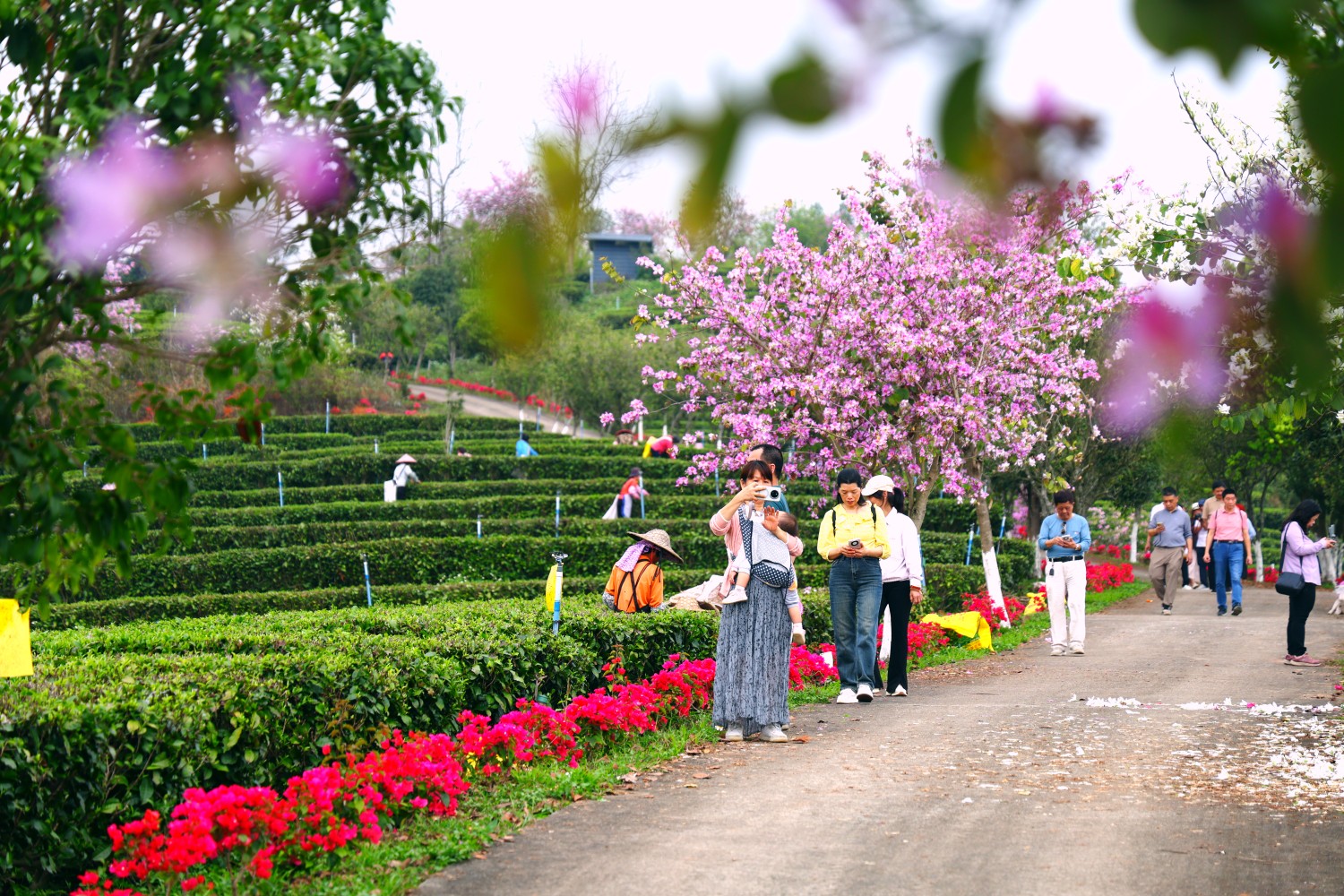 春风拂过,英德市石灰铺镇的创美茶园里,宫粉紫荆竞相绽放。漫山遍野的粉紫色花朵与层层叠叠的翠绿茶园交相辉映,构成了一幅动人的春日画卷。连日来,这片“花园式茶园”吸引了大批珠三角游客慕名而来,成为这个春天英德茶旅融合的一道亮丽风景线。
