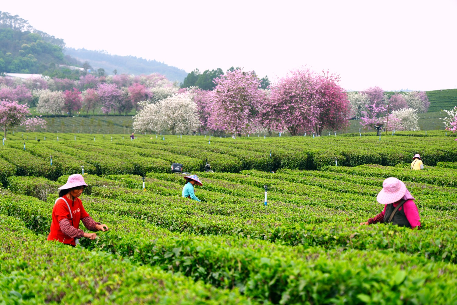 茶园里,采茶阿姨们头戴宽檐遮阳帽,双手在茶垄间翻飞,将茶叶嫩芽轻轻摘下,腰间布袋里装满了鲜嫩的茶芽。一位正在采摘春茶的阿姨说:“这段时间每天都有很多人走进茶园,我们在这样美丽的环境里工作,也觉得没那么辛苦了。”宫粉紫荆开,春茶正香,花园式的茶园里,一幅生机盎然的春采图景跃然眼前。