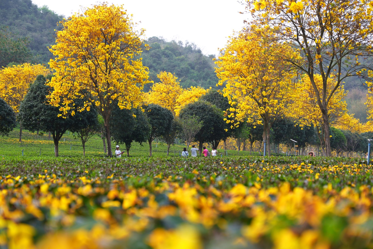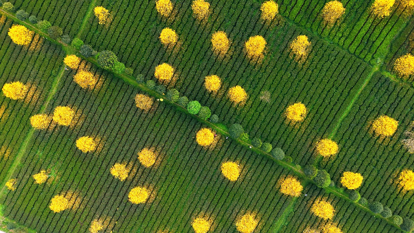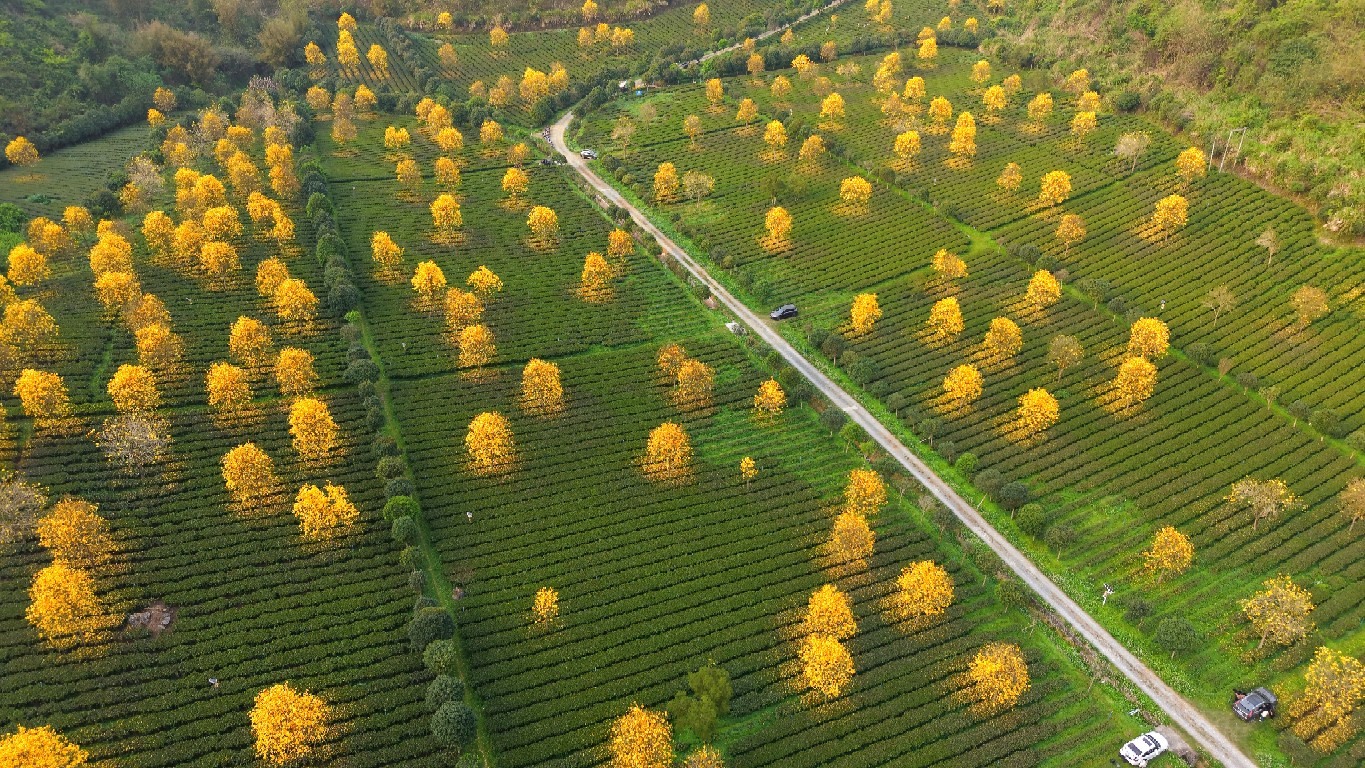 而在不远处的红星茶场,则是另一番诗意风光。一棵棵黄花风铃木错落有致地种植于茶园之中,正值盛花期,金黄色的花朵如繁星点点,洒落在连绵的茶垄间,黄绿相融,仿佛大自然打翻了“调色盘”。