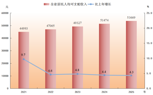 居民收入是衡量一个国家或地区经济发展水平的重要指标之一,也是衡量人民生活水平的重要标准。从收入来看,2025年全省居民人均可支配收入53669元,比上年增长4.3%,扣除价格因素,实际增长4.5%。
