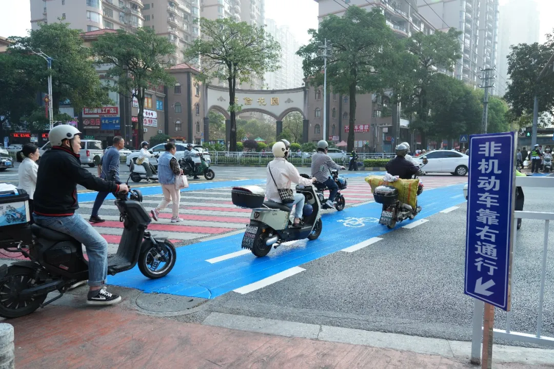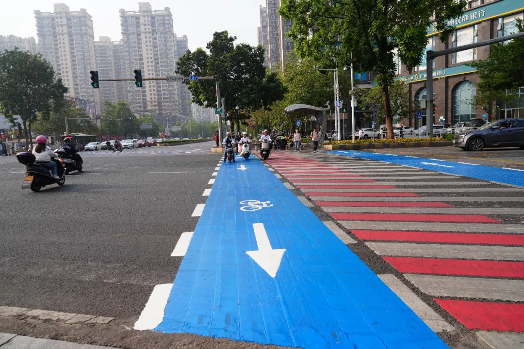 骑电动自行车、自行车的市民沿着浅蓝色专用通道通行,步行的市民走在中间斑马线上,大家各行其道、互不干扰。路口交通环境得到根本性改善,通行体验大幅提升。“以前骑车过这个路口,总是提心吊胆,怕被机动车刮到,也怕撞到行人。现在有了专用道,还设置专门通行标识,顺畅了,也安全多了。”每天通勤经过此地的市民王先生说道。