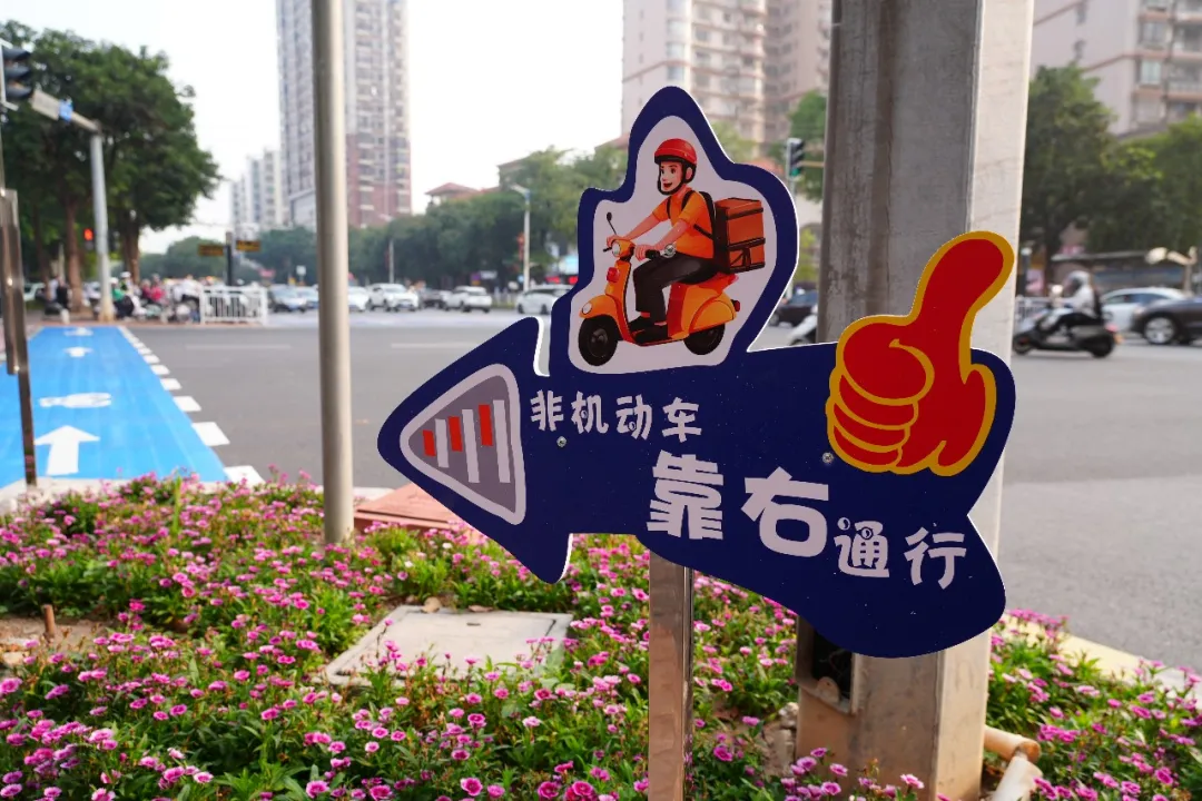 增设“蓝道过街”专用通道,实现路权归位。在斑马线两侧专门施划浅蓝色非机动车骑行专用通道,用标线将行人与非机动车分开,实行“人走中间、车走两侧”的通行模式。配套增设非机动车通行引导标识,让机动车、非机动车和行人各行其道、互不干扰。